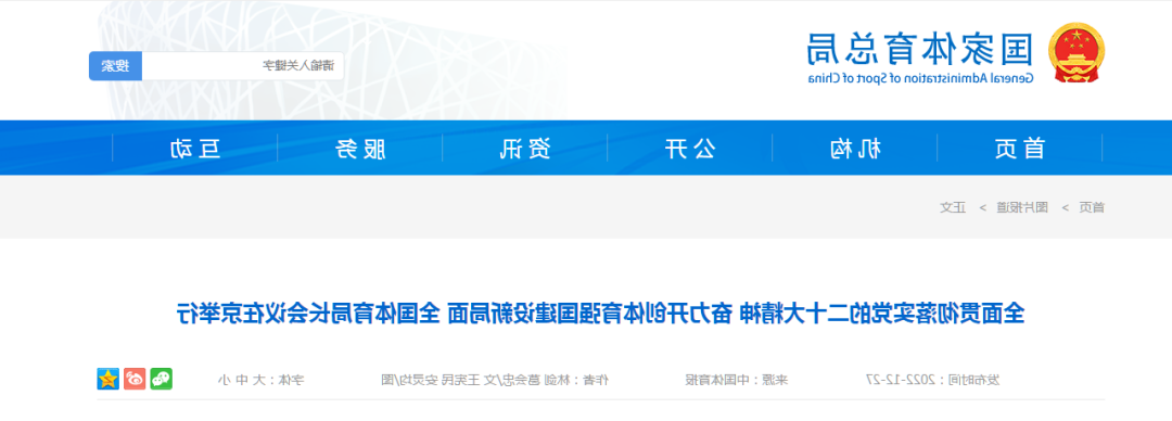 - 12月27日,全国体育局长会议在京举行。会议的主要任务是:以习近平新时代中国特色社会主义思想为指导,全面学习贯彻党的二十大精神,认真贯彻落实习近平总书记关于体育的重要论述,统一思想、凝聚共识,部署20......